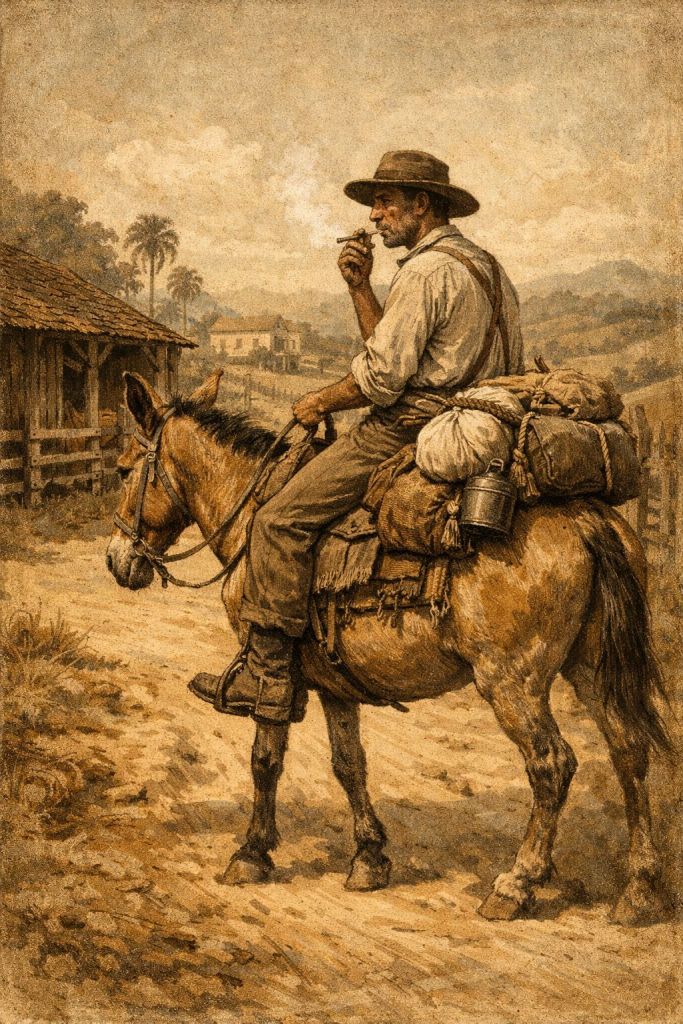 Cheiro de fumo no ar, vai-se o caipira na mula baia, dando de rédea e carregando as suas traias.